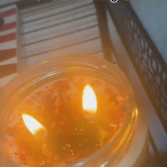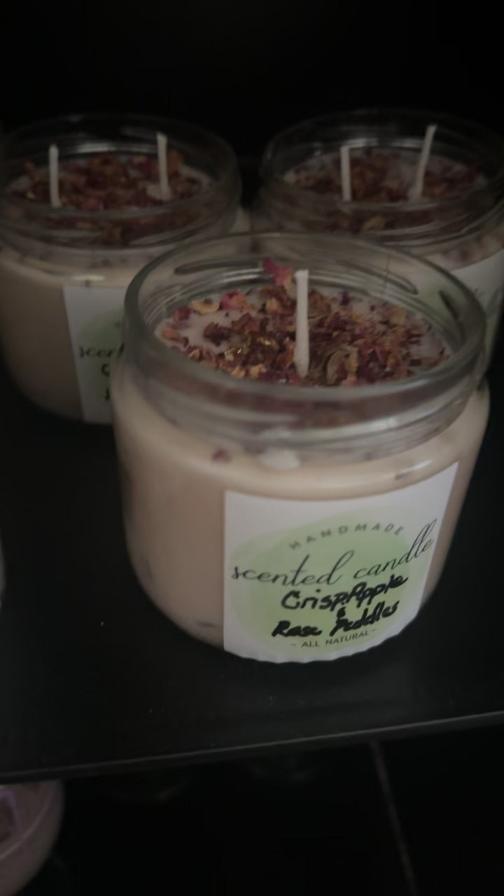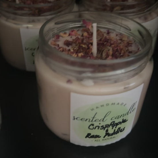 Warm apple pie scented oil infused with dried rose peddles, this candle smells good enough to eat.