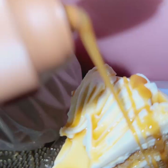 All natural soy wax mixed with a delicious vanilla butter cake scented oil handmade into this scrumptious cake jar filled with pieces of cake topped with caramel buttercream icing, drizzled with caramel sauce.